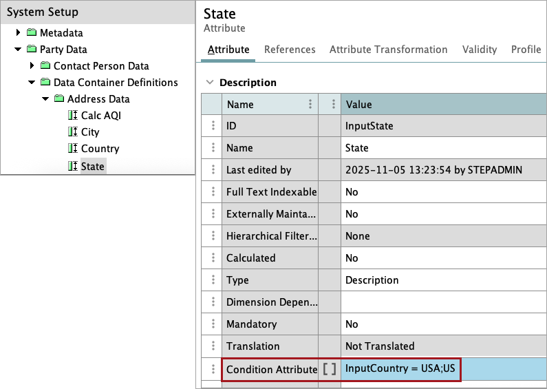 In the new UI, conditional attribute display is available for attributes, as well as data containers, and references. For details, refer to the 'Conditional Attribute Display in New UI for STEP' section below.