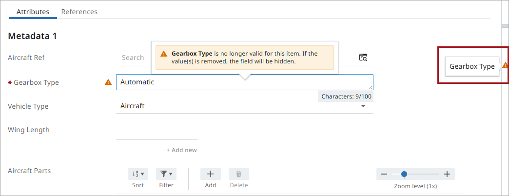 For example, changing the ‘Vehicle Type’ to ‘Aircraft' makes the 'Gearbox Type' invalid.