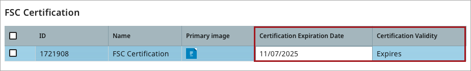 As a result, when selecting ‘FSC Certification’ with 'Certification Validity' = 'Expires', the linked attribute becomes valid.