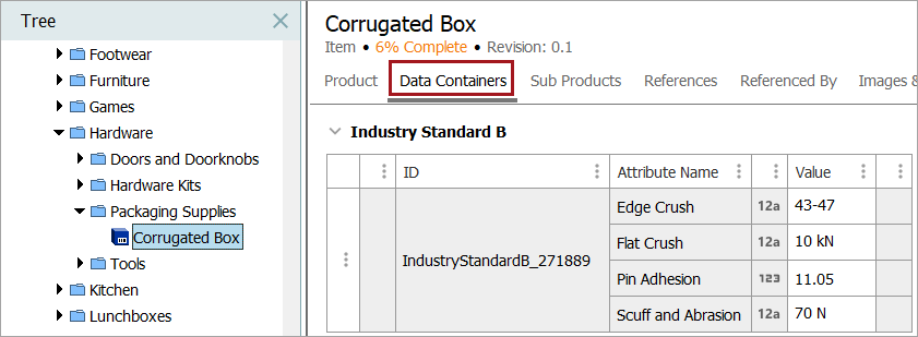 Another example is a composite attribute object that captures data for multiple tests on a single product. Each data container holds values for a single industry standard test (e.g., tensile strength, specific gravity, water absorption). All tests must pass before the product can be approved. Data containers allow a value to indicate pass / fail for each test to be recorded, and workflows / business rules can be used to verify that the product is not approved until all tests pass. The following image shows a product data container that does not allow multiple instances (The 'Allow multiple data containers' parameter is set to No.), so the individual data container attributes are displayed as rows.