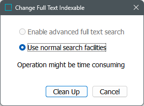 To remove the Full text Indexable = 'Yes' setting, select the field and choose Use normal search facilities and click the Save button. If this operation fails, choose it again, and click the Clean Up button.