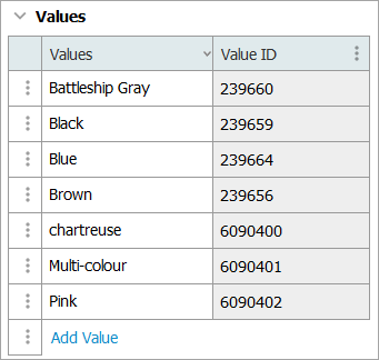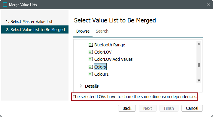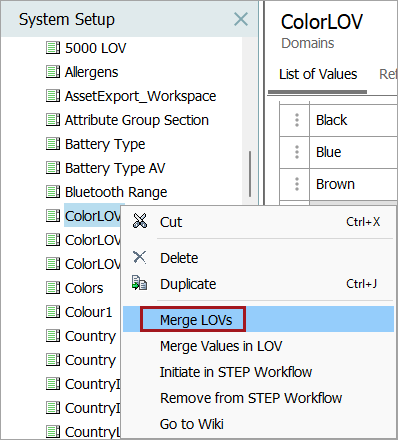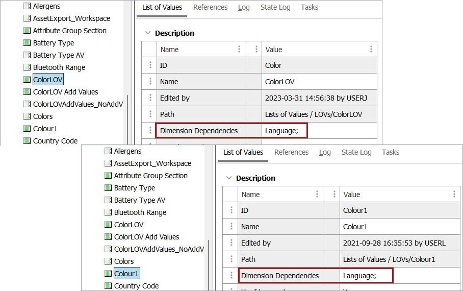 On System Setup, open the Lists of Values / LOVs node and click on each of the LOVs to be merged. Verify the settings within the Dimension Dependencies parameter and the match. For the example below, the two attributes 'ColorLOV' and 'Colour1' have the same value for the Dimension Dependencies parameter.