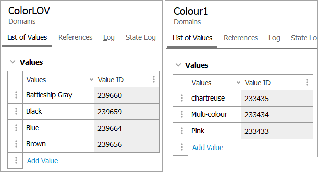 For this example, prior to merging the LOVs, the values for each of the LOVs can be found in the screenshot below.