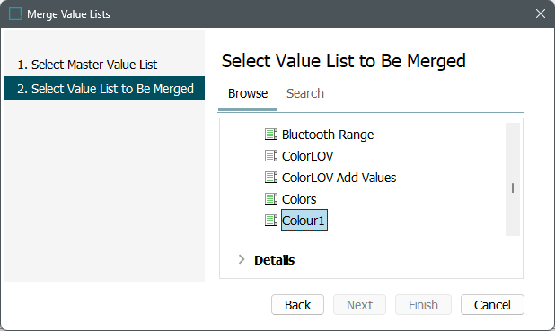 The Merge Value Lists wizard will display. Use the Browse or Search tabs to find and select the LOV to be merged (the LOV that will be deleted) with the primary LOV.