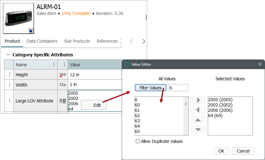 ) arrow buttons to change the order of the highlighted value in the Selected Values list. - Click OK to update the values in the product editor.