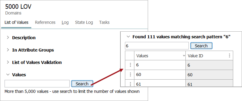 When an LOV has over 6000 values, the full list of values cannot be instantly viewed as it would be for a smaller list of values. To find a specific LOV value, type a few characters to search for a partial or complete match.
