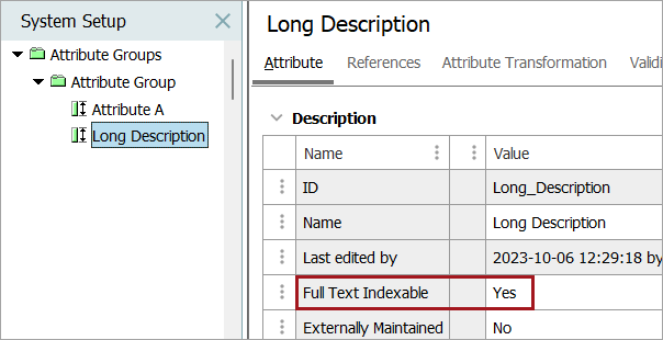 In the workbench, determine if the full text index is enabled, navigate to an attribute in System Setup.