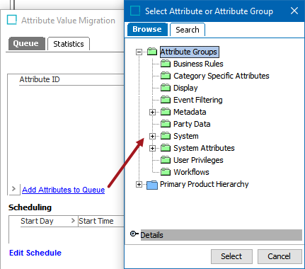 Note: If an attribute group is selected, all attributes belonging to that group are added to the queue. In this example, 'Attribute Groups' is selected, therefore, all the groups below it, as well as all the attributes under each attribute group, are included.