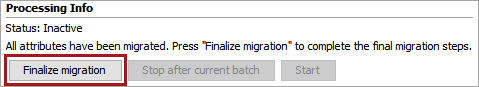 After the values for all migratable attributes on the system have been migrated, the final steps for the migration are ready to be initiated. This status can be noted on the 'Processing Info' section of the 'Attribute Value Migration' dialog.