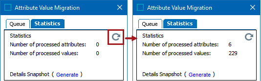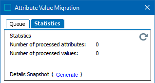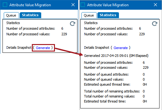 Details Snapshot - Selecting the 'Generate' link creates a snapshot report. This report has information about attributes / values that have been processed as well as queued attributes / values to be processed. Finally, it displays the estimates for the remaining processing time.