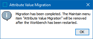 In the workbench, navigate to the Maintain menu and click the Migrate Attribute Values option to display a successful migration dialog. Click OK.