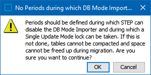 A warning displays if periods defined do not allow the process to disable the database mode importer and/or take a SUM lock. Schedule periods are required to complete the migration.