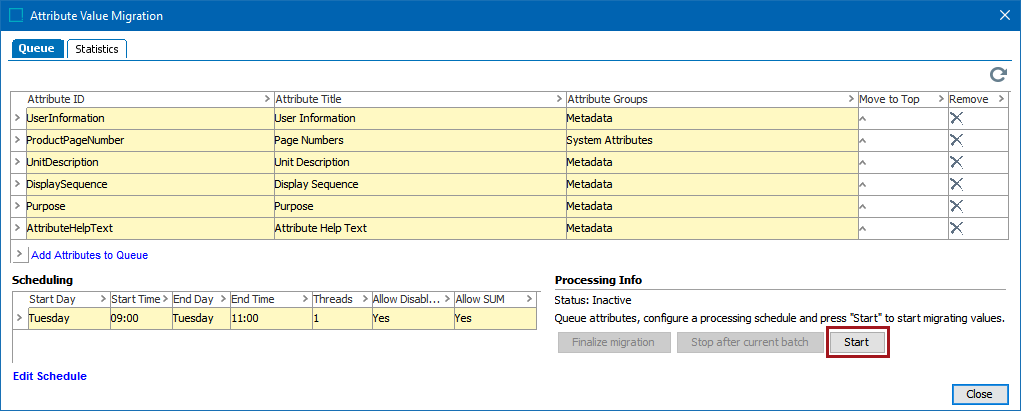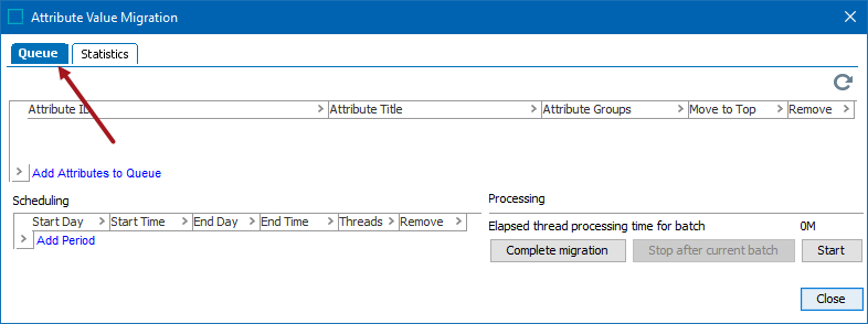 The 'Attribute Value Migration' dialog displays and the Queue tab is selected.