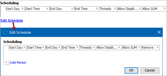 If overlapping schedule periods are defined, the period with the fewest restrictions and the highest number of threads is used.