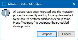 To postpone completing the migration for any reason, in the workbench, on the Maintain menu, navigate to and select the Migrate Attribute Values option. On the dialog box, click the Postpone button to postpone the final steps of this migration. Selecting this option requires that you finalize the migration again from the Attribute Value Migration tool.