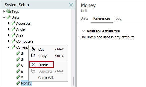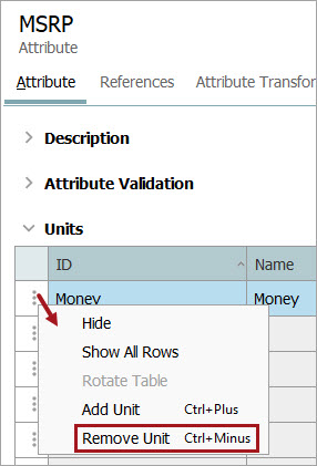 In the unit editor, when no attributes are displayed on the References tab for the 'Valid for Attributes' section, right-click the unit node and click the Delete option.