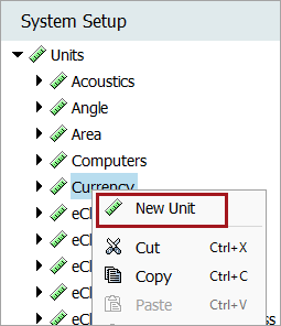 Go to System Setup, open the Units node and click the relevant Unit Group. Right-click the relevant Unit Group and click the New Unit option.