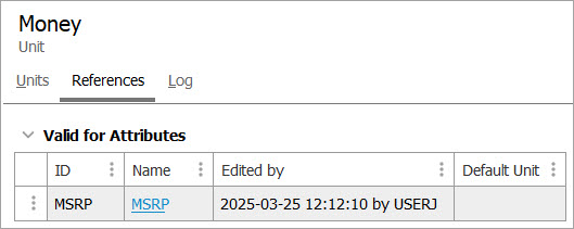 On the units editor, click the References tab to display the 'Valid for Attributes' section.