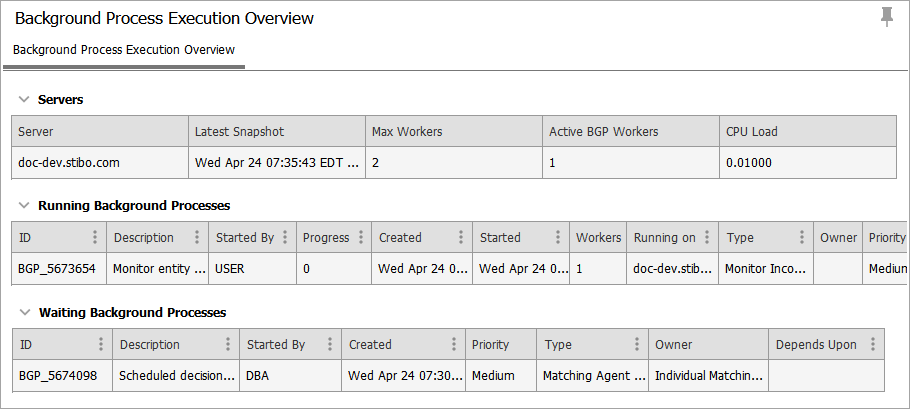 The 'Background Process Execution Overview' includes sections for Servers, Running Background Processes, and Waiting Background Processes.