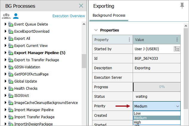 Users with the 'Manage Background Process Execution' setup action can set the priority of waiting BGPs and scheduled BGPs directly in the workbench Background Process editor. This allows admin users to make ad hoc changes to how waiting processes are prioritized or how a scheduled process is prioritized. By default, BGPs other than EPs and IEPs have priority level 'Medium.'