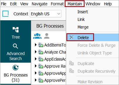From the toolbar, click the Maintain menu, and select Delete to remove the background process.