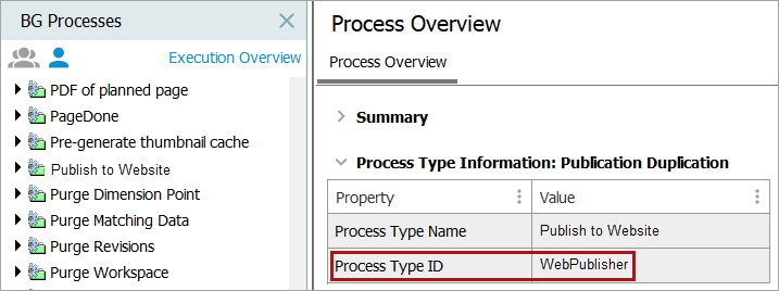 - Right-click the value of the Process Type ID, copy and paste the value to a temporary text file. In this example 'WebPublisher' is copied and pasted. This value will be used to set the configuration property below.
