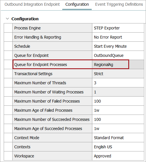 In the previous examples, the techniques involved configuring several BGPs (using a standard queue, for example, 'OUT') to use parallel processing and/or to change the number of processes that can run concurrently. In some situations, however, the requirement may be to configure a single OIEP to run in parallel to process the related data faster. In this case, define a dedicated queue specifically for the OIEP using the 'Queue for endpoint processes' parameter on the Configuration tab as shown in the image below.