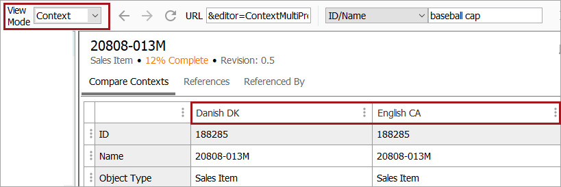 The context mode view allows users to compare values in multiple contexts. For example, selecting contexts that include values in different languages displays the language-dependent attribute values for each context.