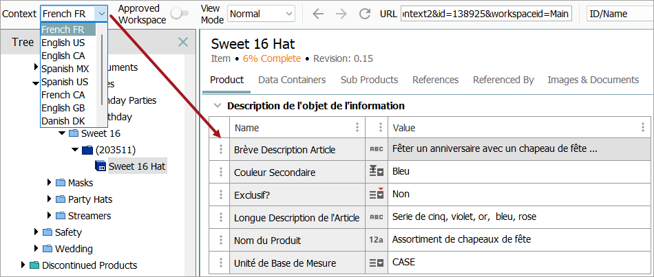 When selecting a context from the Context dropdown list in the upper left of the STEP Workbench interface, the product data being viewed will change and only data that is valid within the selected context will be displayed. The below screenshot shows a list of contexts available within this specific STEP instance and the view of French data.