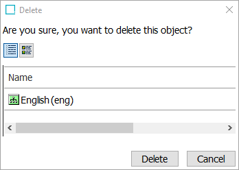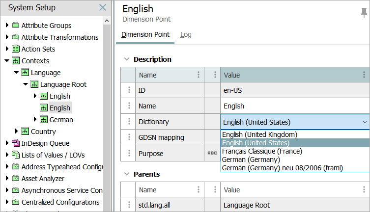 A 'dictionary' can be selected for each dimension point in the language dimension. The dictionary is used to check spelling when values are typed. The list of available dictionaries on each STEP system depends on a license. Your list of dictionaries may not correspond to the list in this example.