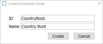 In the Create Dimension Point dialog, type the ID and Name for the new dimension point, then click Create. Pressing Enter on the keyboard after adding the ID duplicates the text in the Name field.