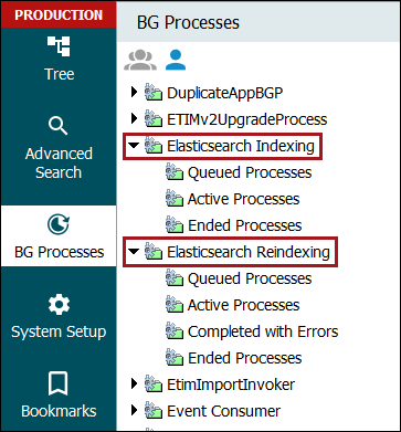 The background processes for both the controlling reindex background process and subprocesses can be viewed from the BG Process tab. The Elasticsearch node contains reindex subprocesses and the event processor background processes while the Re-index node contains the controlling reindex background processes.