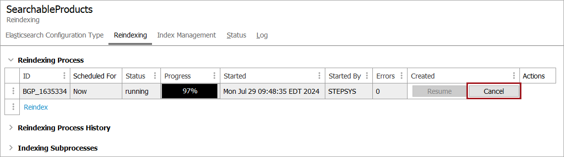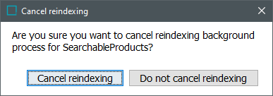 Canceling a reindex event causes both controlling and subprocess background processes to be aborted with no possibility to resume. The Cancel button will only be available if a cancellation is not already in progress.