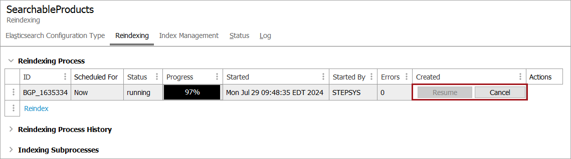 In the case of an Elasticsearch Server not being configured correctly, errors due to incompatible schema, incompatible version of Elasticsearch server, etc., or internal STEP errors, a 'Failed' status displays in the Execution Report. Once the error has been resolved, the controlling Reindexing background processes can be resumed by clicking the Resume button or the Indexing background processes generated by the event processor will reattempt at the next incremental update.