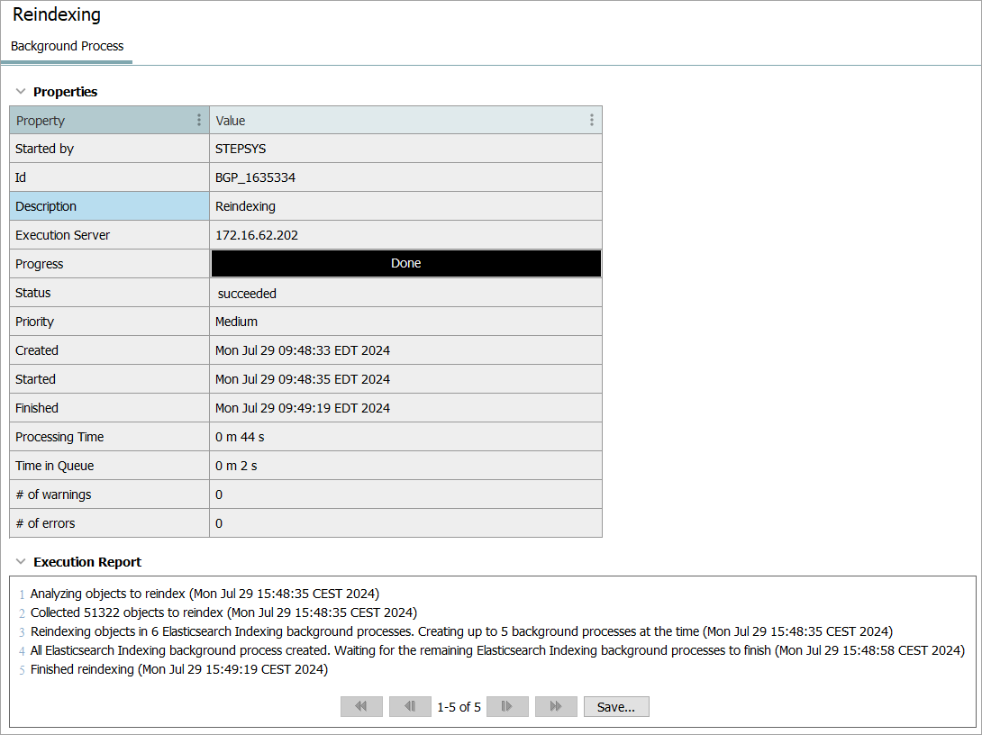 On the Background Process tab for the selected background process, review the Properties and the Execution Report. The progress of reindexing can be tracked with the progress bar located under the 'Progress' parameter. The execution report is a full summary of what occurred during reindexing.
