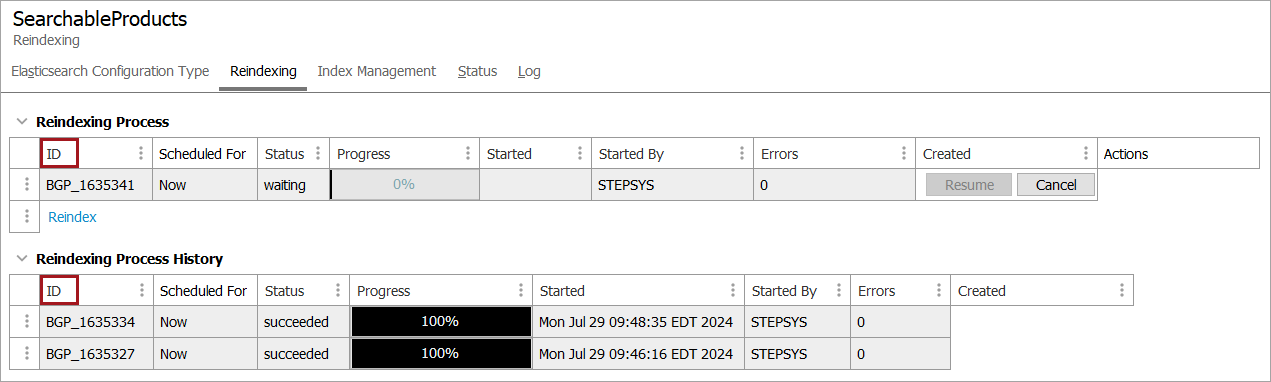 The Reindexing tab on an Elasticsearch configuration provides a list of current and previous reindex events. Details of the background processes are also available from the BG Processes tab in the STEP Workbench. Refer to the Elasticsearch Indexing Background Processes section for additional information.