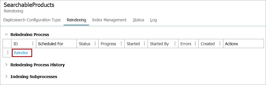 Only one reindexing process can run at a time. If the user tries to start a new reindex process, the message 'Reindexing is already in progress' will display.