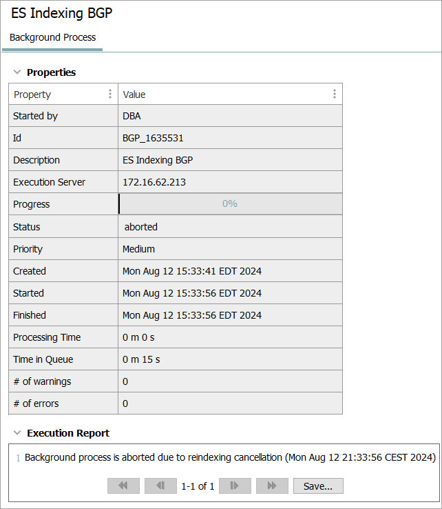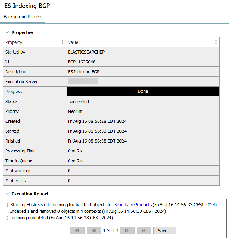 Click an Elasticsearch Indexing background process link to view an execution report for the selected background process.