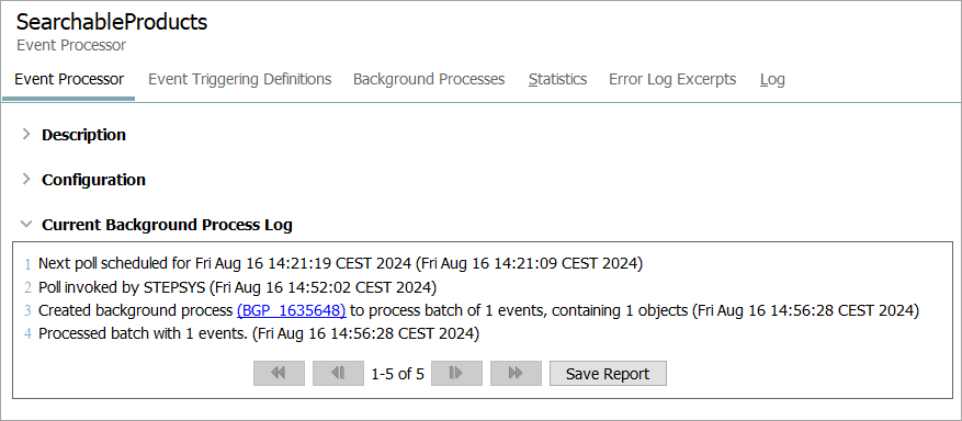 The Elasticsearch event processor is used to process incremental update events. It polls for new events every 10 seconds and when an event is found, an Elasticsearch Indexing background process is created.
