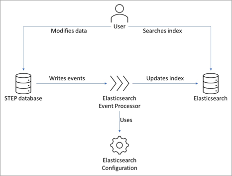Creating an Elasticsearch configuration automatically creates or identifies the related event processor. The Elasticsearch configuration triggers a background process that collects STEP data indicated by the configuration and delegates the indexing to multiple Elasticsearch indexing background processes that run concurrently to push the data to the Elasticsearch database. For more information, refer to the Elasticsearch Index Publishing topic.