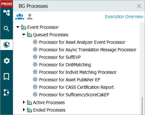 An active event processor uses an associated background process to handle the scheduled invocation of the processor. The event processor's Background Processes tab contains information about the available processes. Hover over a BGP ID to display the background process link, click it to open the individual background process.