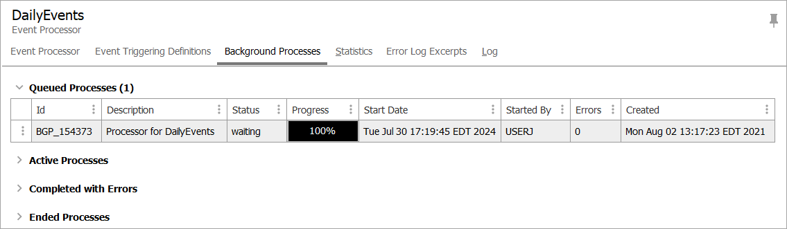 Note: The functionality of the event processor Background Processes tab is the same for integration endpoints.