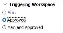 This section is displayed in rare cases, specifically, only if either the 'Main' or the 'Main and Approved' option was previously selected in a release where the option was available. Not all EPs allow triggering from the Main workspace due to limited use case requirements and the impact to performance. However, for some EPs, it is necessary. For information about triggering from Main for a specific EP, refer to the appropriate topic in the Configure Event Triggering Definitions section below.