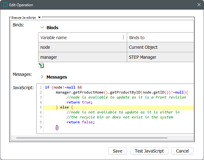 When set to 'No', either the EP fails when attempting to process events for deleted objects or the deleted object handling is addressed via JavaScript. When Skip Deleted Nodes is disabled, and the selected business rule commits changes to nodes, use JavaScript to determine if the node exists with the following considerations: