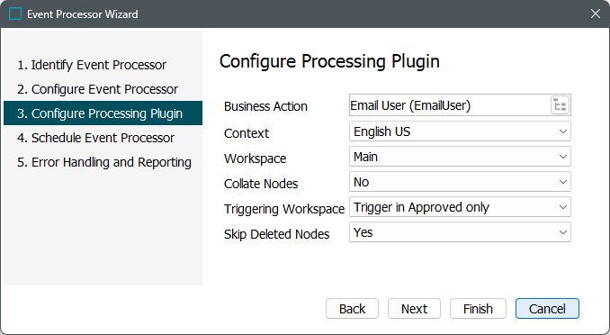 Each of the relevant parameters for the Event Processor Wizard 'Configure Processing Plugin' step are described below. Any additional wizard parameters with importance for this plugin are also included in this topic.