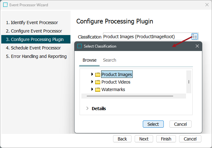 For the event processor to take effect, it must be configured to only listen for changes on asset type objects housed within the same previously selected classification folder.