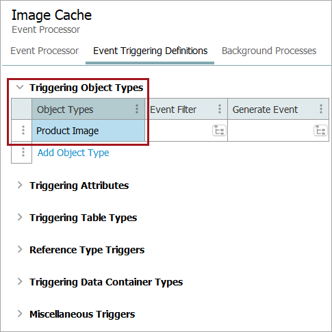 Important: You must select at least one asset type for Triggering Object Types, or nothing will be processed by the event processor.