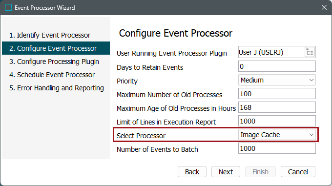 To access the 'Configure Processing Plugin' parameters as shown below, the Image Cache processor must be selected within the Select Processor parameter during the wizard step 'Configure Event Processor.'