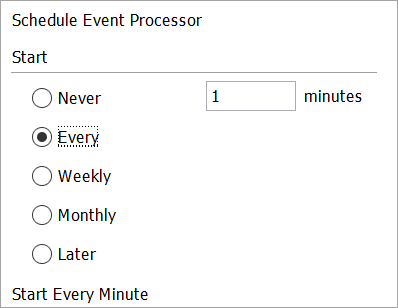 - Every - automatically run the event processor repeatedly, every selected number of minutes. One (1) minute is the shortest interval allowed and is closest to real time. Enter the number of minutes in the text box. The selection is summarized at the bottom of the dialog.