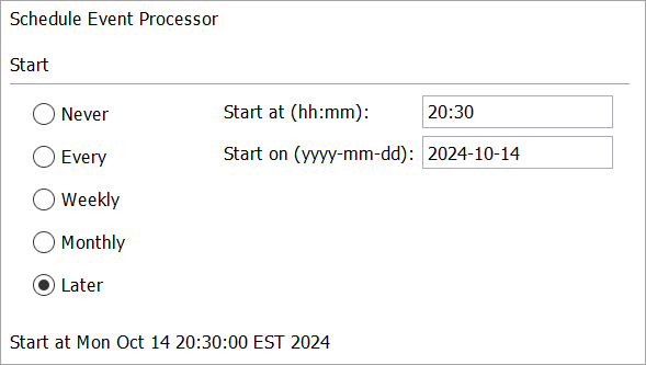 - Later - automatically run the event processor only once, at the time and date specified. The selections are summarized at the bottom of the dialog.